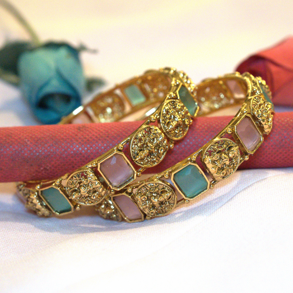 Antique Gold Lakshmi Temple Design Pink and Green Stone Bangles Size 2.8