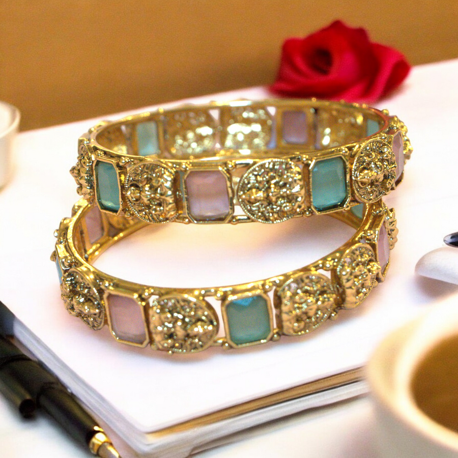 These imitation fashion ornate bangles blend the classic Lakshmi temple motif with vibrant pink and green stones, all set in antique gold. They're a colorful and meaningful accessory for any festive occasion or cultural event.