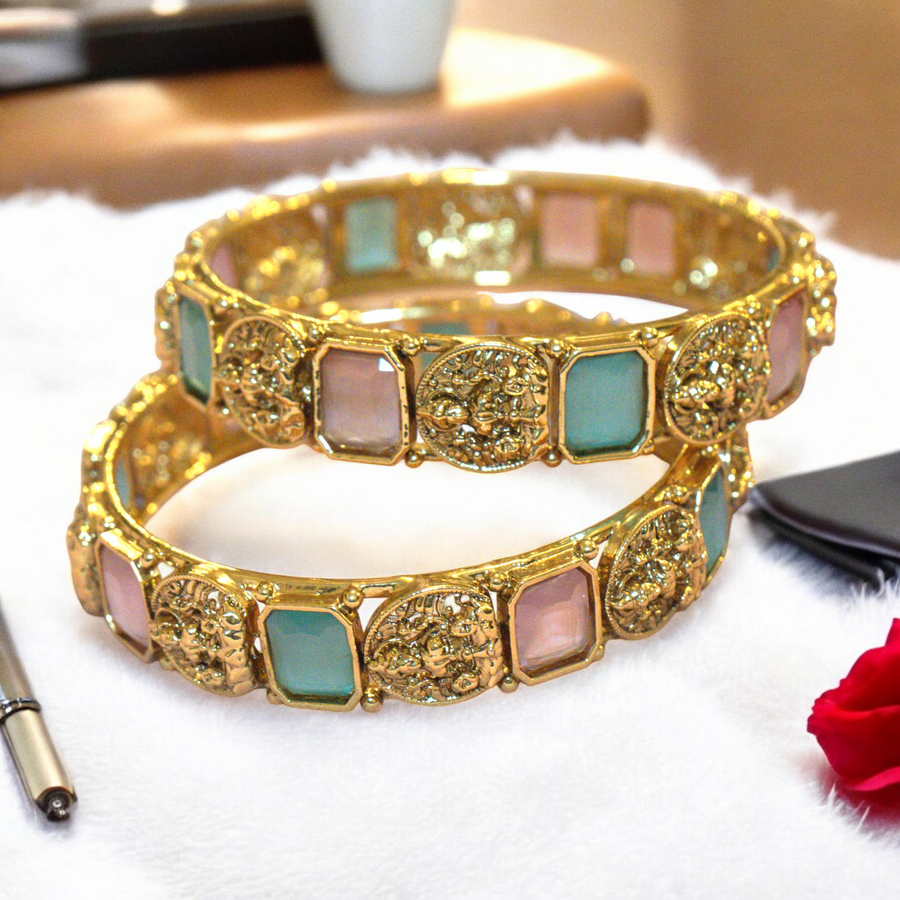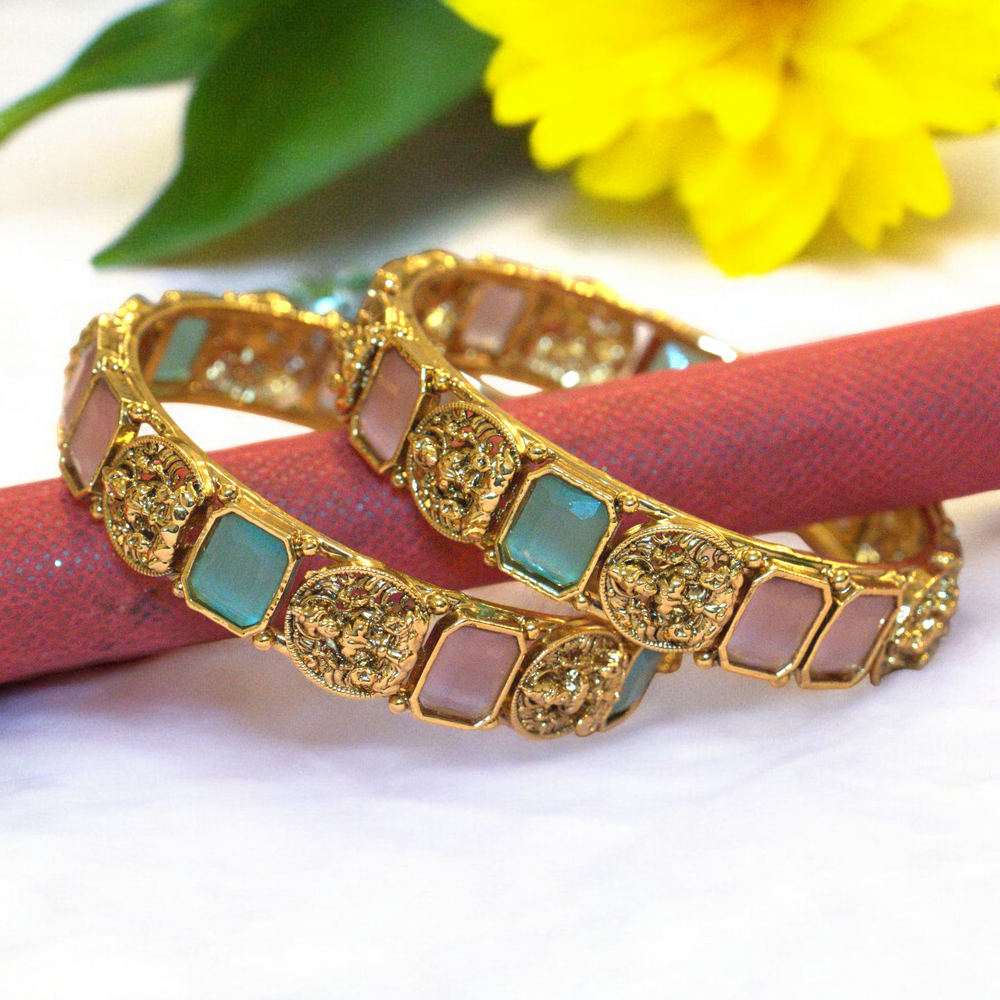 Antique Gold Lakshmi Temple Design Pink and Green Stone Bangles Size 2.8