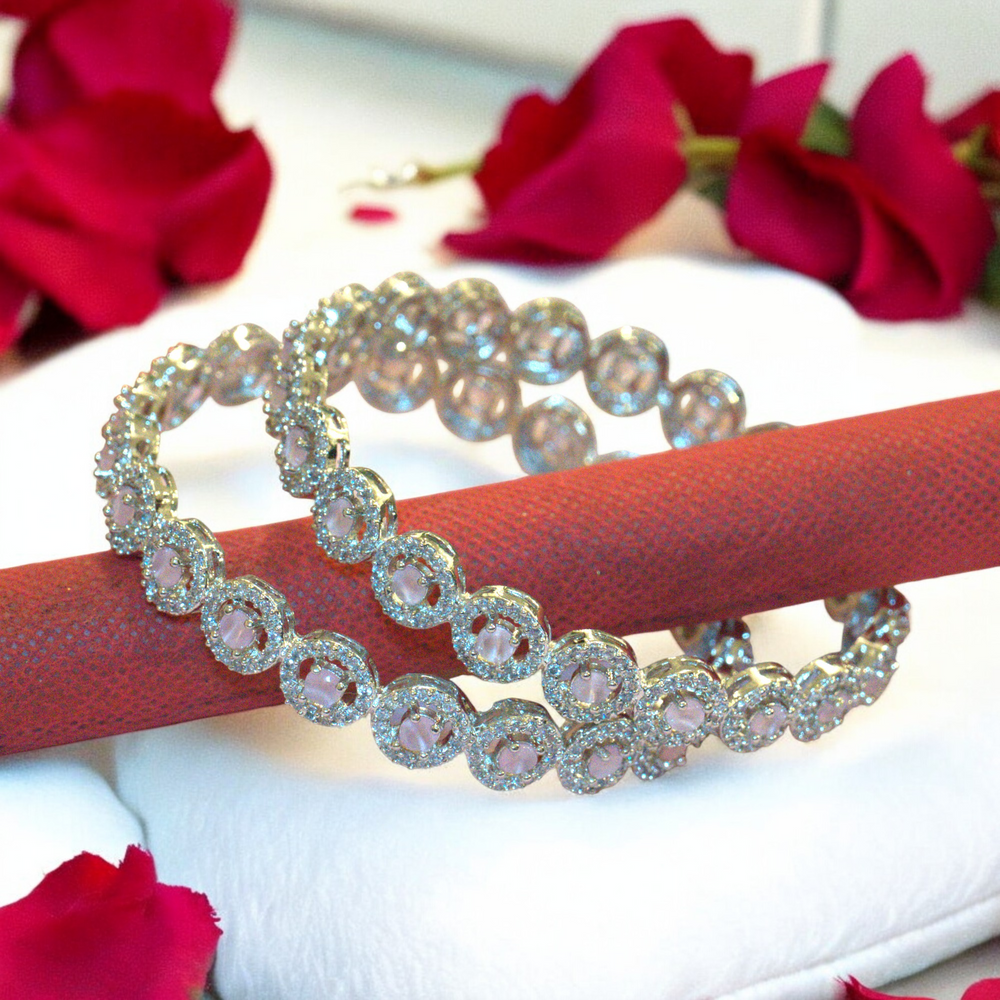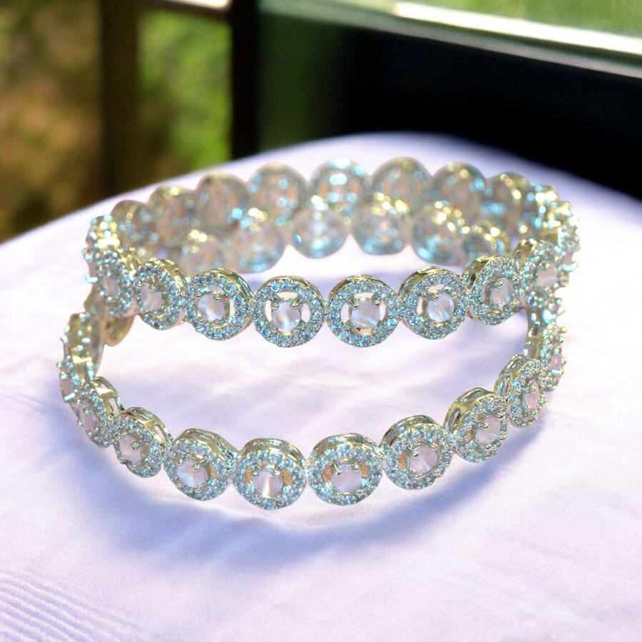 These luxurious bangles combine the luster of Rhodium plating with the sparkle of CZ and the brilliance of AD stones. Sized at 2.10, they are perfect for adding a touch of glamour and elegance to any special occasion or everyday wear.
