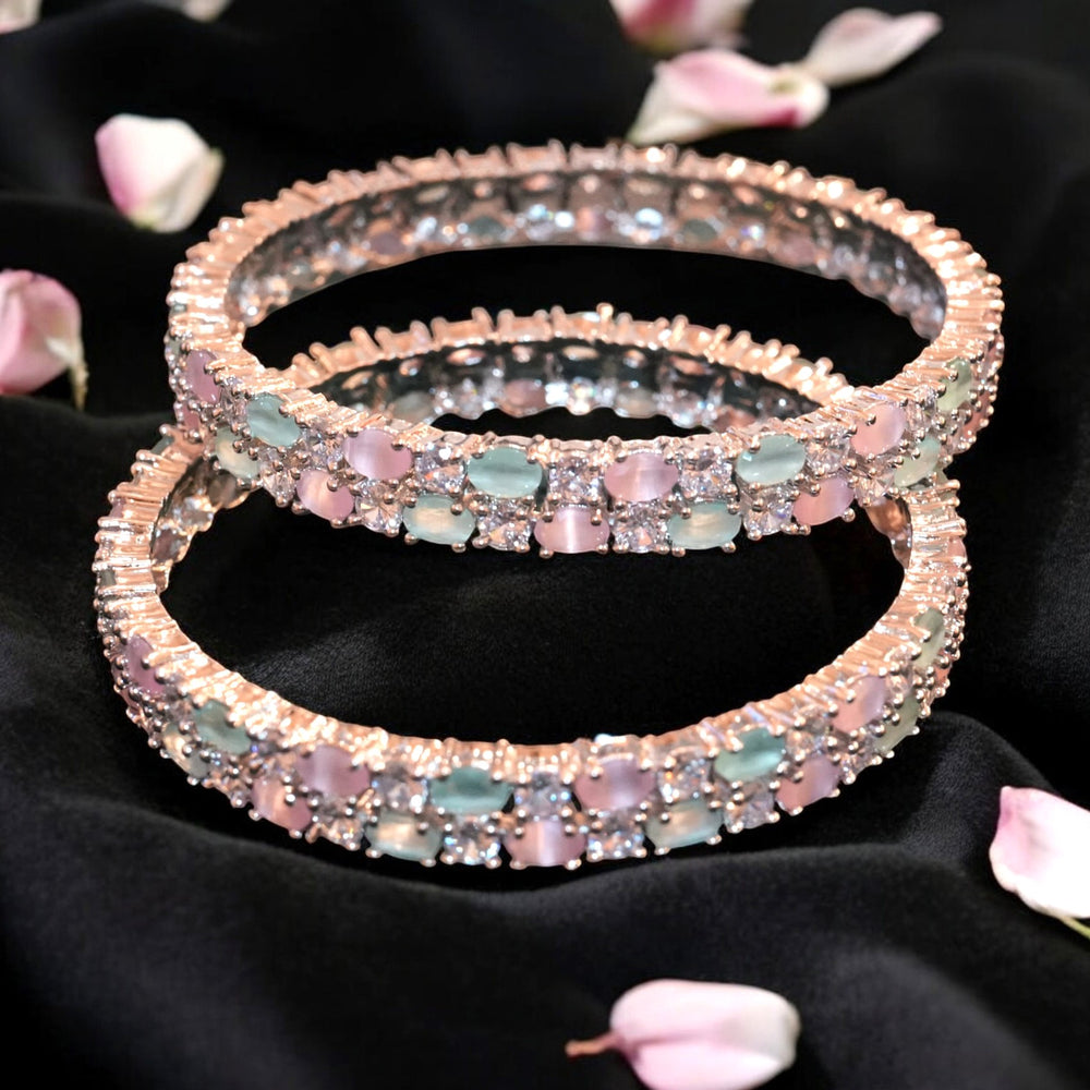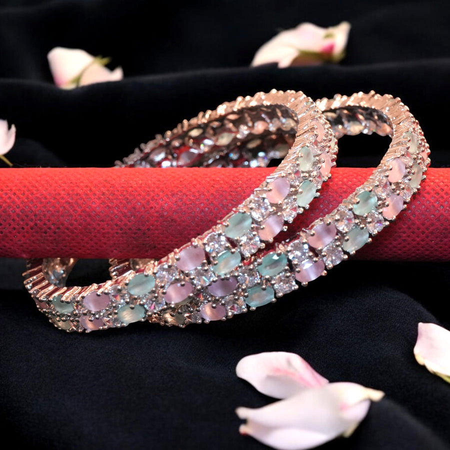 These sleek Rhodium-plated bangles are adorned with CZ and AD stones, offering a contemporary look with a touch of sparkle. Perfect for both daily wear and special occasions, they provide a versatile accessory option.