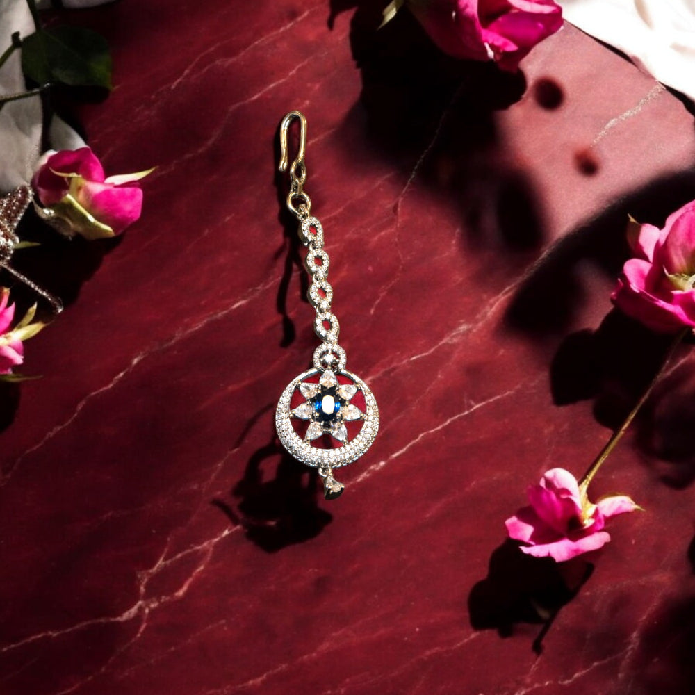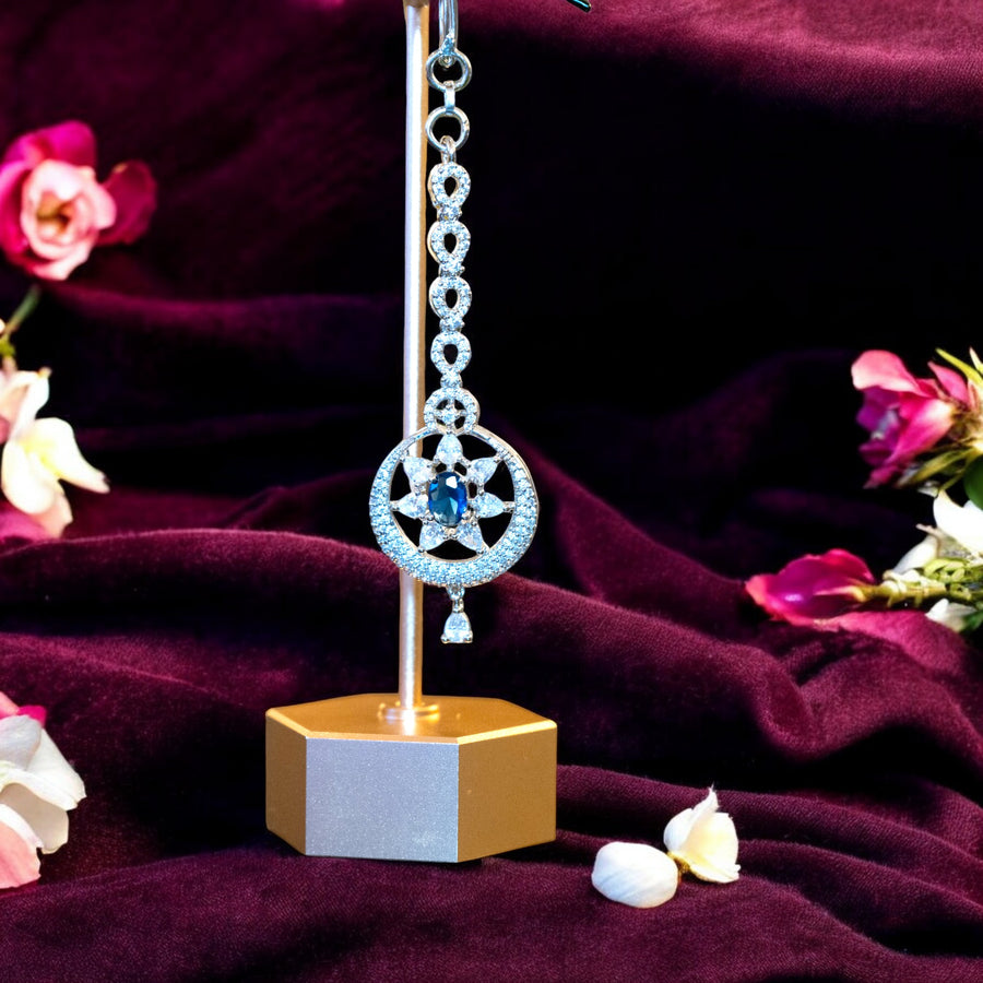 This beautifully crafted Nethi Sutti features a blue stone centerpiece surrounded by sparkling CZ stones set in a rhodium finish, perfect for adding a touch of color to any formal or bridal look.