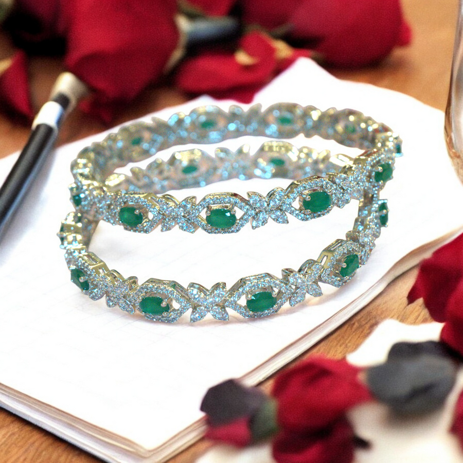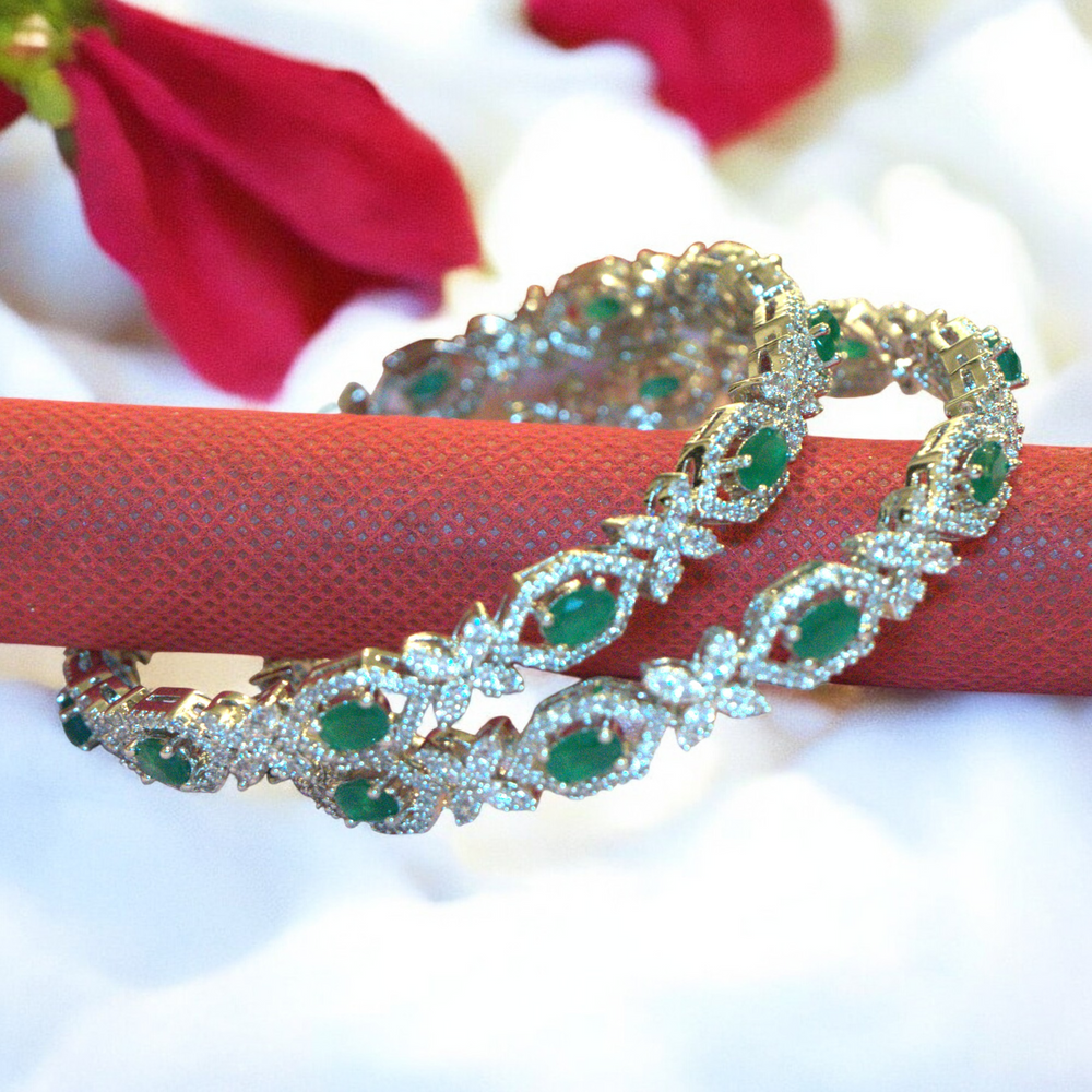 These striking bangles feature a vibrant emerald green AD stone set in a glossy Rhodium finish. Perfect for adding a pop of color to your wardrobe, these bangles blend classic elegance with modern style.