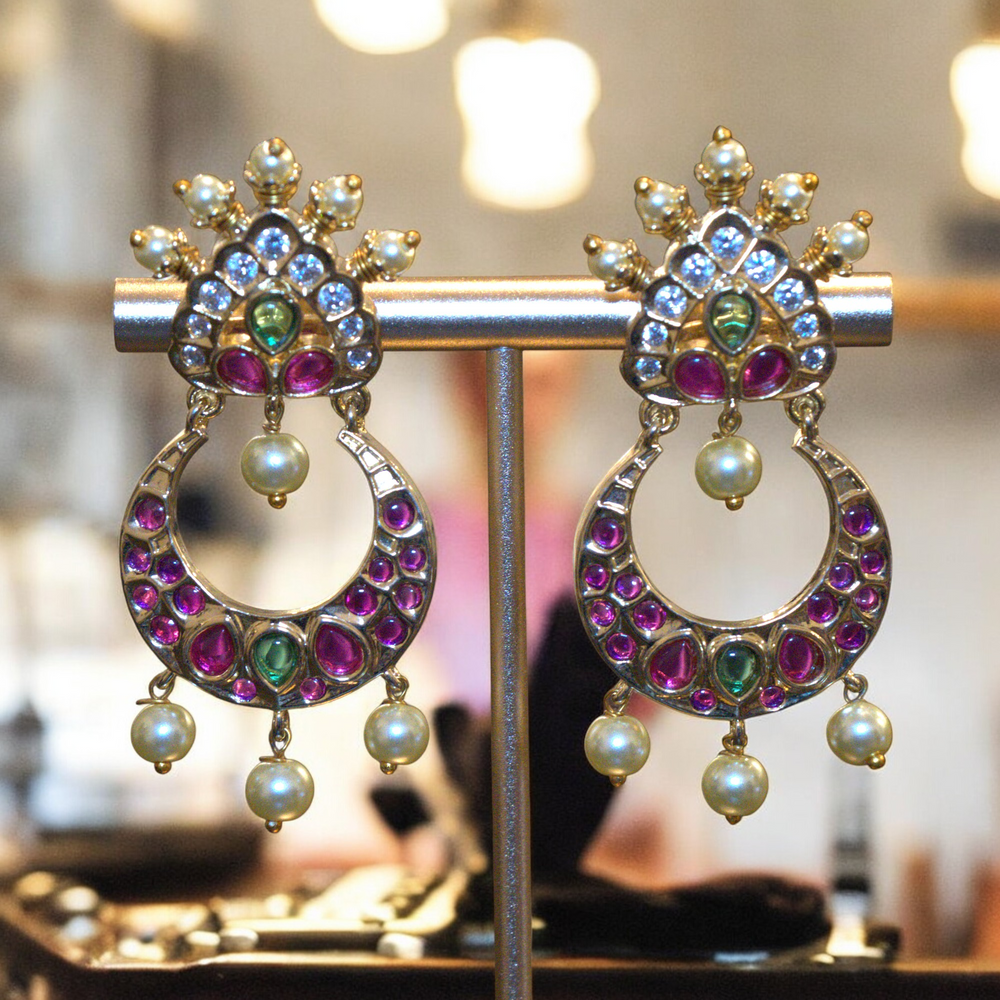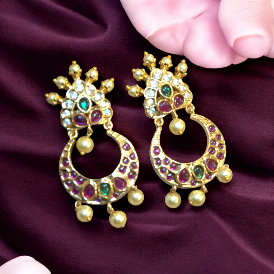 Exquisite Chandh Bali type earrings crafted in a Micron finish, featuring photo stones and Kundan embellishments. These earrings are perfect for those who love statement pieces with a touch of traditional flair.