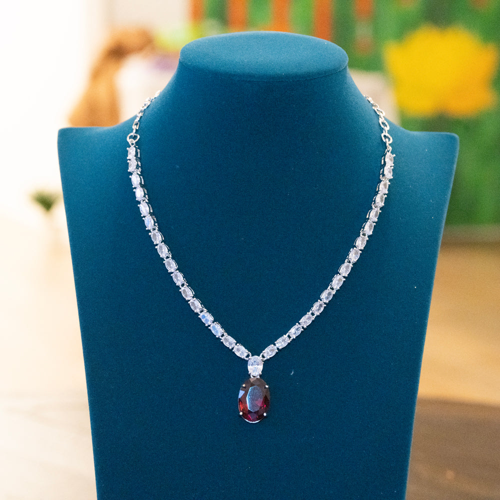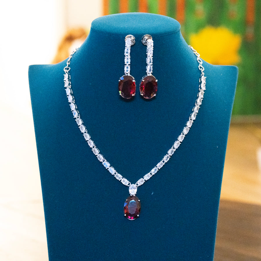 This elegant necklace features a vibrant greenstone pendant, beautifully complemented by the shine of AD stones, all set in a sleek rhodium finish. Ideal for adding a touch of color and sophistication to any ensemble.