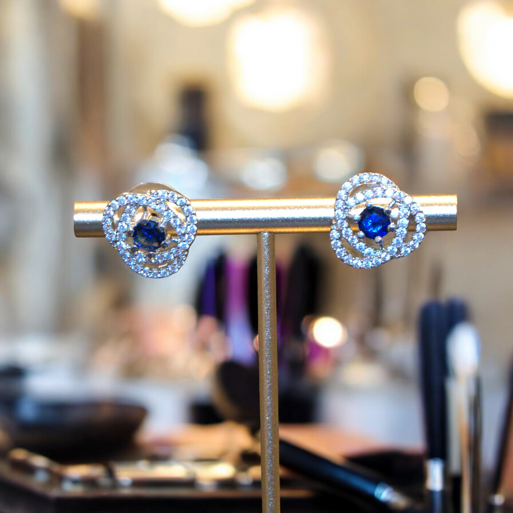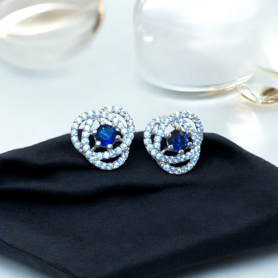 Exquisitely crafted with a stunning blue sapphire stone and baguette-cut CZ, these Rhodium-plated earrings exude sophistication. Perfect for special occasions, they add a touch of luxury and vibrant color to any ensemble.