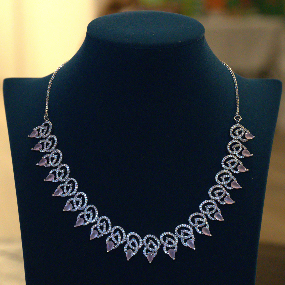 This delicate necklace, set in a sleek rhodium finish, features sparkling CZ stones alongside beautiful pink stones, offering a graceful and attractive look suitable for various occasions.
