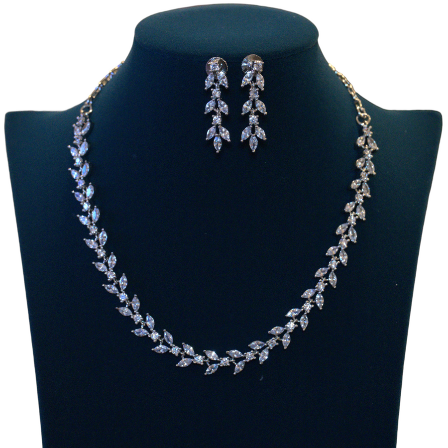 This necklace set features an elegant design with white stones and CZ, all set in a gleaming rhodium finish. Perfect for any modern, sophisticated look, this piece adds a touch of glamour and luxury to any ensemble.