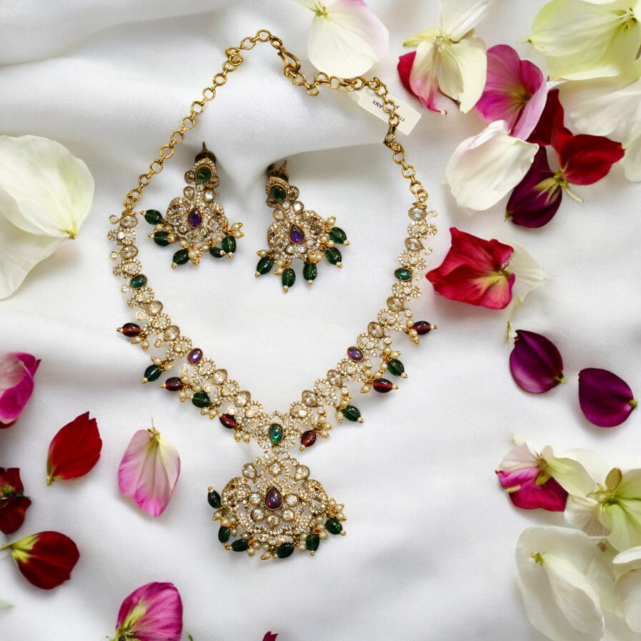 Immerse yourself in the charm of the Victorian era with this stunning Elephant Locket Necklace Set. Elegantly crafted with Micron plating, adorned with Kundan and CZ stones, this necklace set features a majestic elephant (Hatti) locket as its centerpiece. It's the perfect blend of historical elegance and modern craftsmanship, ideal for making a statement at any celebratory event.